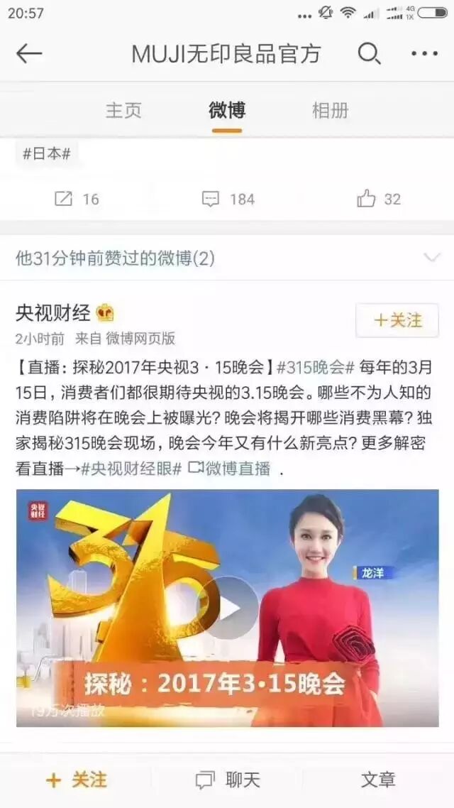 例如日本杂货品牌“无印良品”,在央视315晚会开始前居然淡定地给央视点了个赞(就是介么自信)。