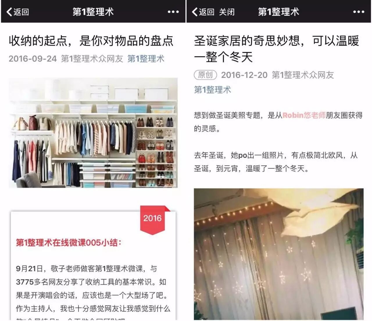第四类内容来自课程。“第1整理术”签约了整理美学方面的老师,做课程的时候,她便和老师约好,每个星期或每个月给几篇原创稿件。这些文章既能为课程打气,也能传递知识和理念,成为“第1整理术”日常内容的重要组成部分。