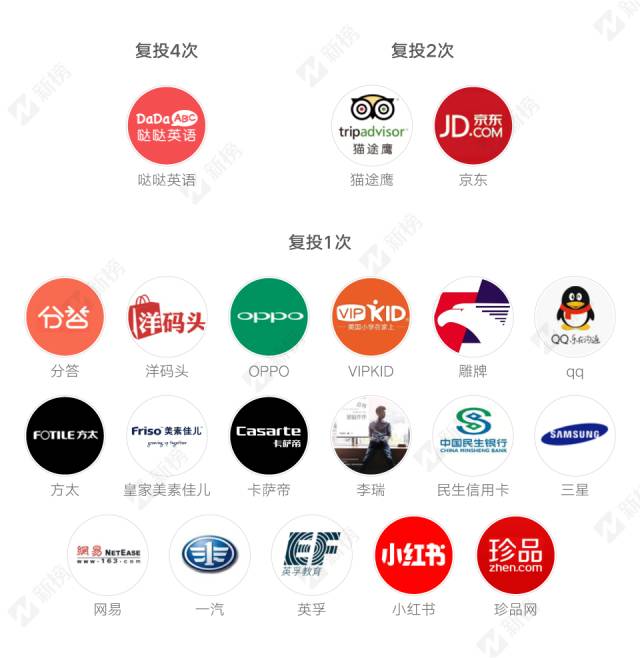 据新榜统计,包括咪蒙自己在内,“咪蒙”一共有118个广告主,有20家广告主进行过复投,其中哒哒英语的复投次数最多。从2016年5月至今,哒哒英语与咪蒙共合作过5次,仅今年就投放了两次,称得上老金主。其次,京东和猫头鹰分别投放过3次。