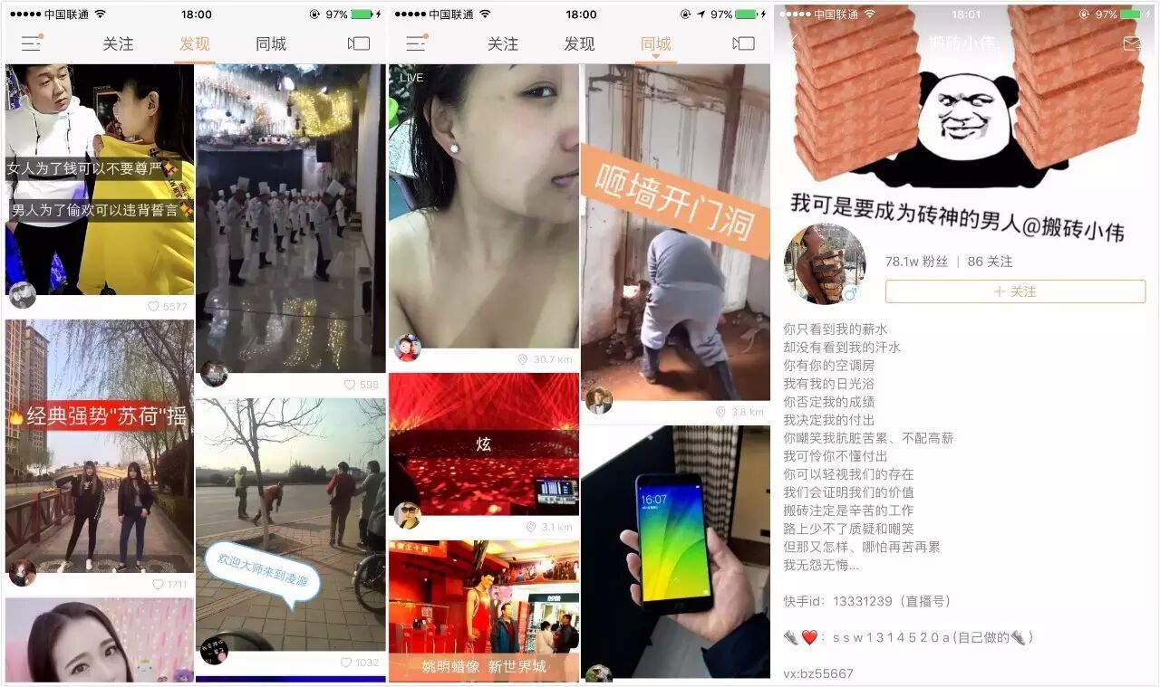 尽管自残等怪异视频在快手上只占很小一部分(也是平台审查过滤的对象),更多是普通人的衣食住行和喜怒哀乐,比如搬砖工人、插秧农户、下厨主妇和挑水男子,但那些通过爆文首次知道快手并下载它的人很快发现:看不下去,适应不来,接受不了。