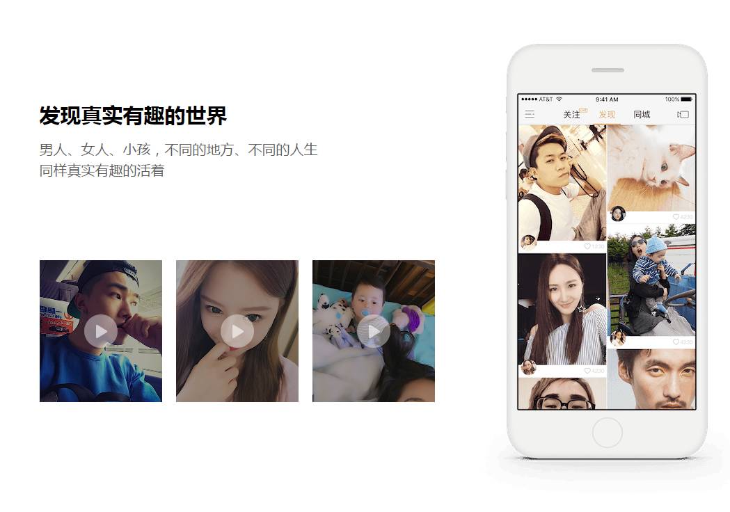 在未登录状态下,它的首页只有一屏,邮票大小的视频封面图片塞得满满的,点击即可观看;而在登陆状态下,它有三个栏目:关注、发现和同城,点击右侧摄像机器标志则进入视频录制/直播状态。