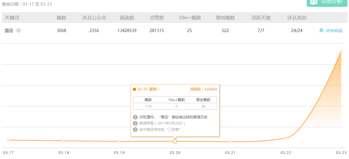 新榜讯 昨晚,在长沙举行的2018年俄罗斯世界杯预选赛亚洲区12强赛中,中国队以1:0战胜韩国队。据新榜每日持续监测的36.4万数据样本显示,3月23日昨天一天,提到“国足”的文章共计有1875篇,22篇10w+。抢手速的小编们辛苦了!