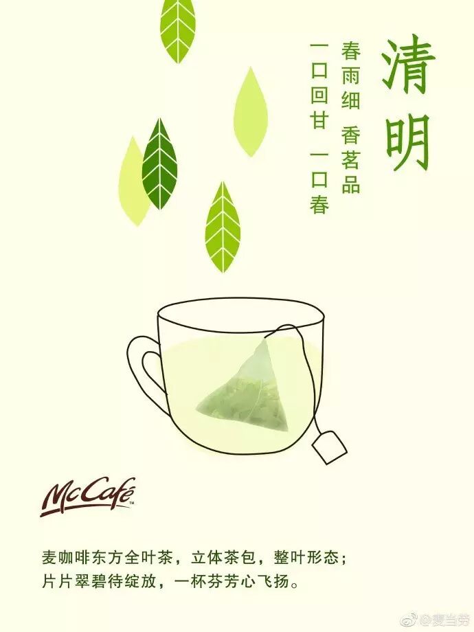 @麦当劳 春雨细,香茗品,一口回甘一口春。麦咖啡东方全叶茶,立体茶包,整叶形态;片片翠碧待绽放,一杯芬芳心飞扬。