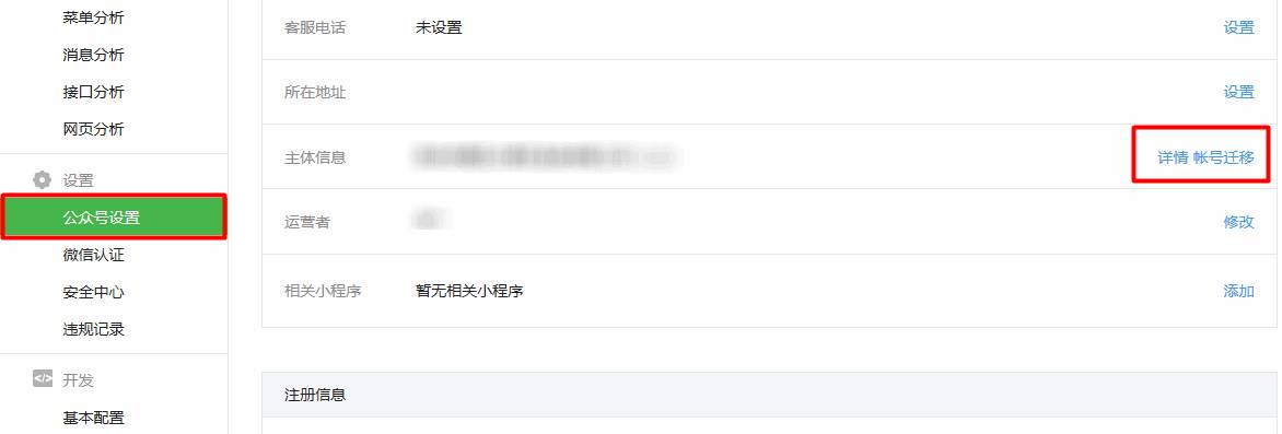 迁移入口:官网登录公众平台--设置--公众号设置--主体信息--帐号迁移