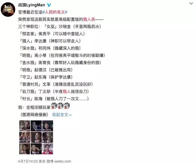 比如“宇宙学生圈”发文《为什么<人民的名义>给我一种玩升级版狼人杀的错觉?》,将网友演绎的狼人杀版、骗子版、书记粉撕逼版一一呈现。一部政治反腐大剧成了狼人杀经典教程。