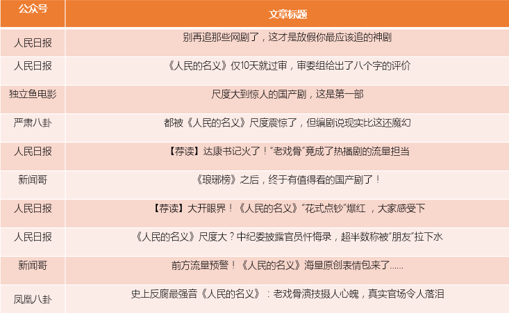 比如前几日发出的文章中,不少公众号将《人民的名义》称为电视剧中的清流,将其称为“史上尺度最大反腐剧”“史上最大尺度的官方自黑”,盛赞剧中老戏骨的演技和聚焦现实的表达。