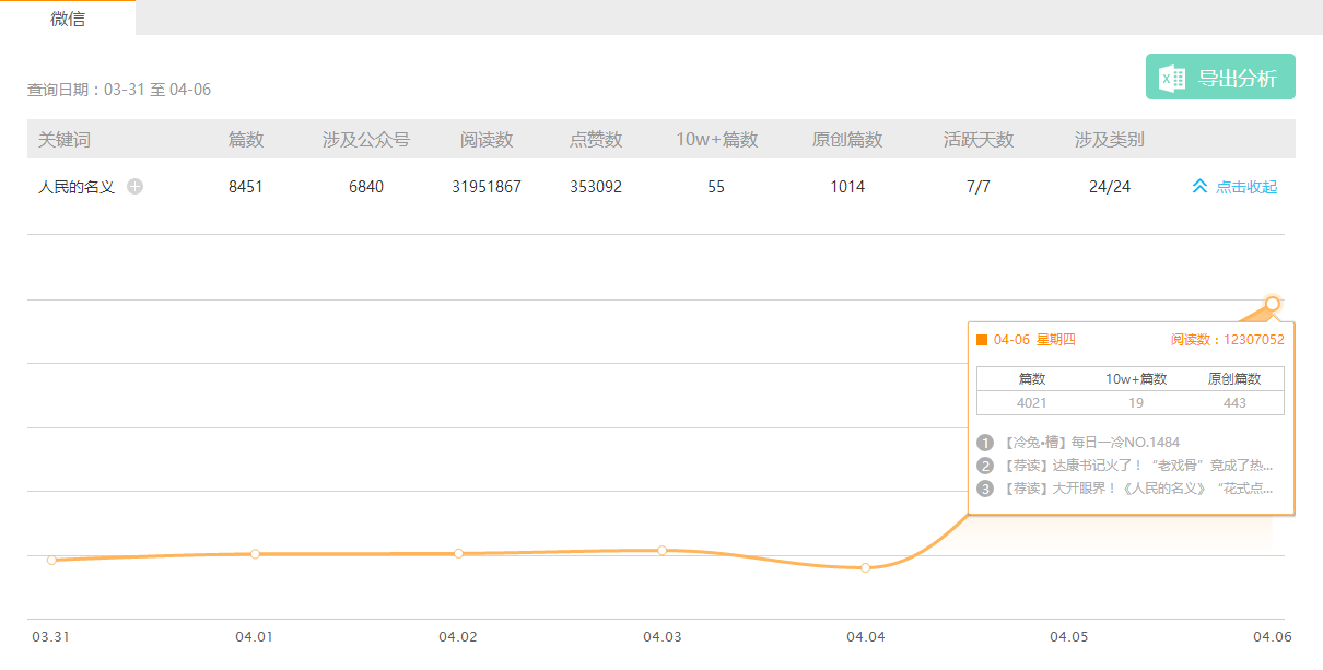 据新榜日常采集库的微信公众号(现已超过36万个)数据显示,最近一周内,有8451篇微信文章提到“人民的名义”,其中包含55篇10w+爆文。无论是新榜微信趋势查询、微指数、百度指数或相关微信指数,都呈现斗坡式上升。