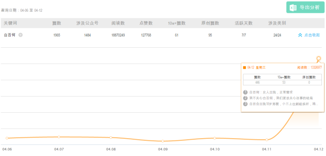 根据新榜日常连续监测的36万个微信公众号,仅昨天一天,就有446篇推文追了“白百何出轨”的热点,其中,包括《白百何:女人出轨,正常需求》《我不关心白百何,我们更该关心这事的结局》《白百合出轨18岁男模,小三上位剧组捉奸,她的负面八卦就没停过》《白百何:是他先勾引我的!!!》等文章在内,共诞生了53篇阅读量达10w+的爆文。