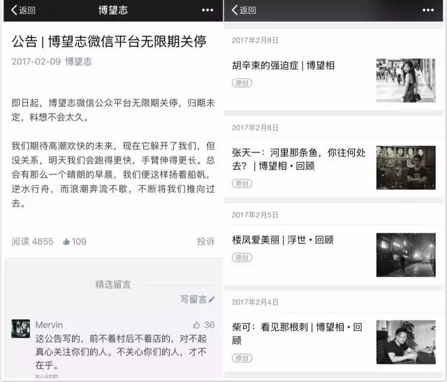 2月9日,“博望志”发布公告称其微信平台将无限期关停。2016年3月,博望志由北京一批财经媒体人发起创办,该媒体聚焦于创业圈的人物故事。博望志旗下栏目《博望相》出品多篇创业人物特稿,包括对高晓松、宋柯、许知远、陈年等人的深度专访,快速聚集起一批质量黏性俱佳的读者。