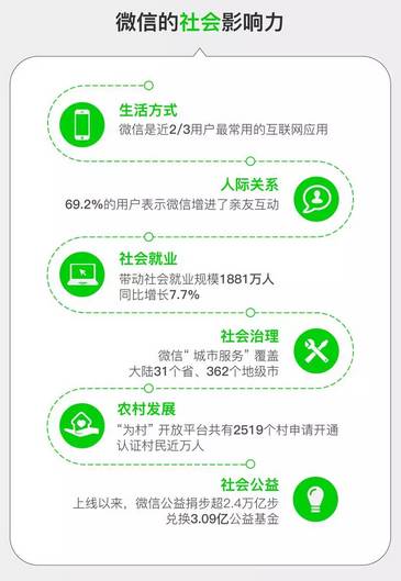 据《2016年微信社会经济影响力研究》报告显示:2016年,微信拉动全社会消费4475亿元,同比增长37.6%,其中带动就业规模达1881万人,同比增长7.7%,其中直接就业466万人,间接就业1415万人。