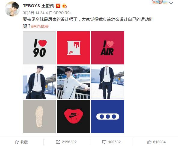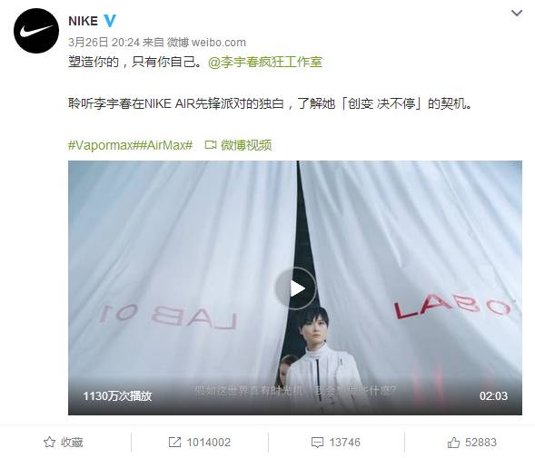 而与此同时,一向少有娱乐明星露面代言的耐克似乎也蠢蠢欲动,先是请王俊凯到访全球总部,之后又请来权志龙、李宇春等偶像明星。效果也是显而易见的,王俊凯、李宇春的相关微博轻而易举就能获数百万转发曝光。