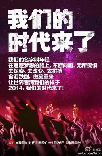 2014年,广告片《我们的时代》走的是青春励志路线,与“为发烧而生”的口号也算密切相关。