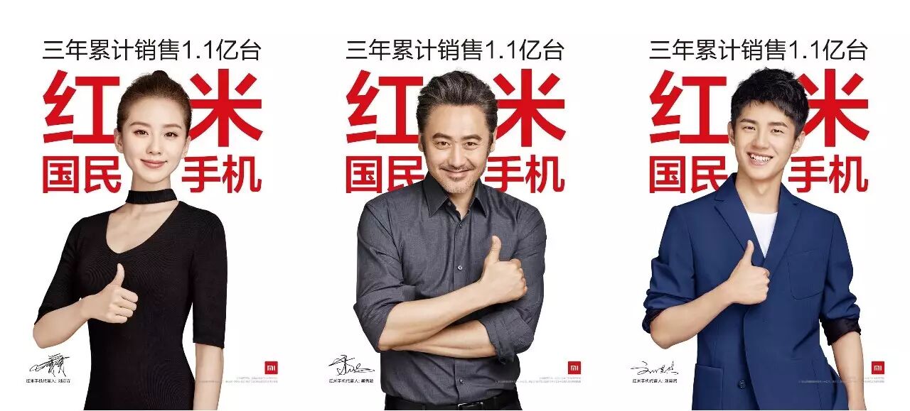 同样在2016年,一向在代言上省钱的小米,先是请了吴秀波、刘诗诗、刘昊然来代言红米,推出“国民手机”概念,并为他们定制明星专属配色;