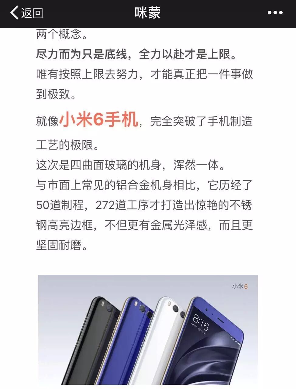 此外,小米这次还做了一些大号的广告投放,比如昨晚咪蒙的头条文章,就出现了小米6的身影。截至今年3月,咪蒙的头条报价已经达到68万。