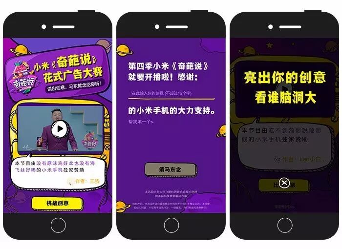 围绕《奇葩说》的花式广告,小米和奇葩说合作推出了一款H5,用户可以创作专属口播,“让马东念给你听”。
