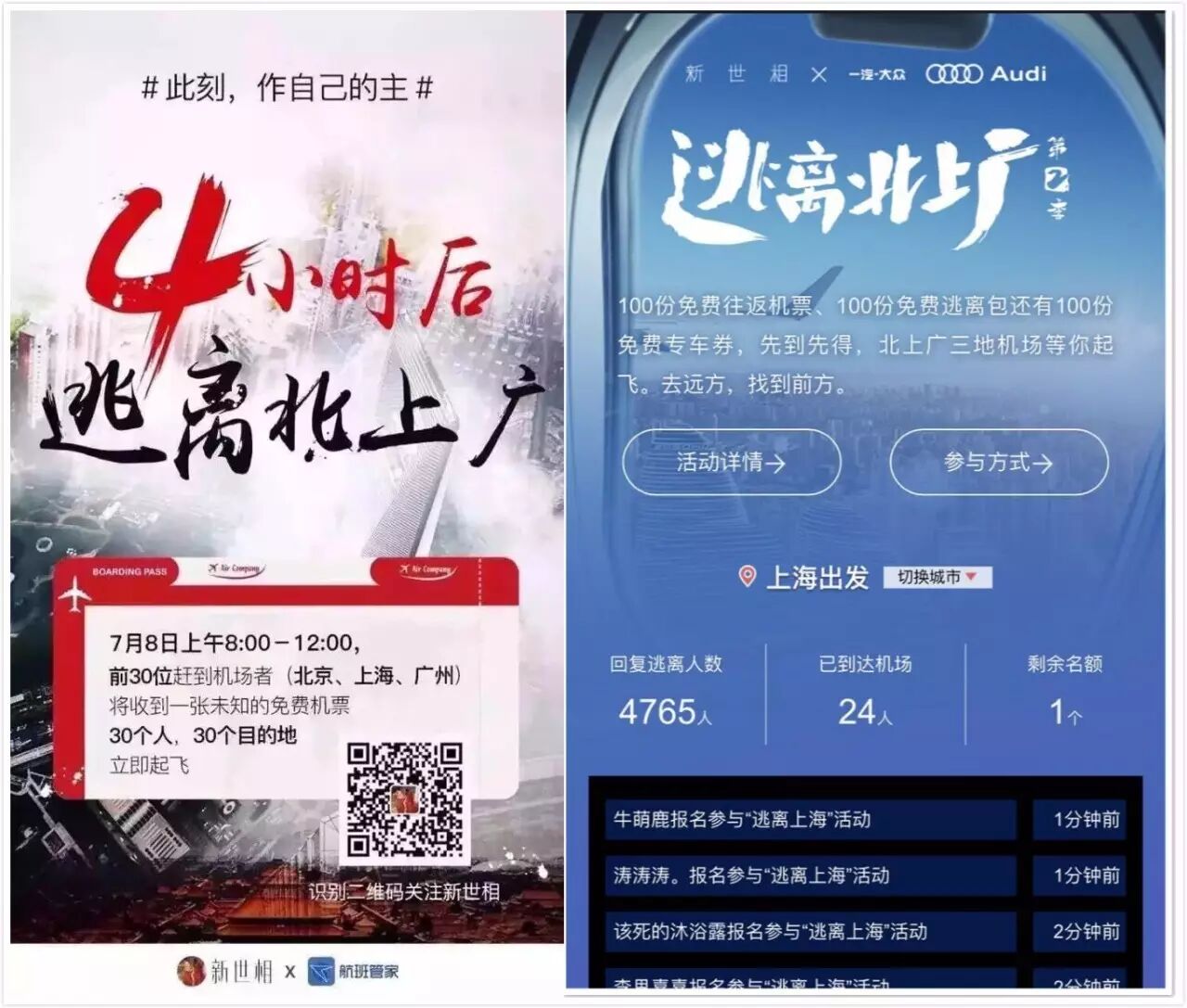而这一次,“新世相”再一次发起“4小时逃离北上广”活动,引人关注同时也引来一些对比和争议,例如“相同的创意是否能重复使用”等等。