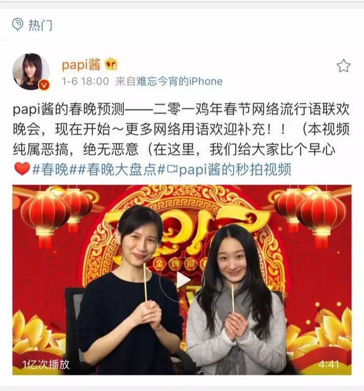 papi酱:对,像播放量过亿的那期春晚预测就是。(该期在腾讯视频被删除,但微博上还在)那天其实我们是在聊另外一个选题,聊到十点多十一点多了,大家说歇一会儿,然后就聊起来春晚,说到了好玩的地方,然后就说那就拍视频,很快,当天晚上两点多就拍完了。