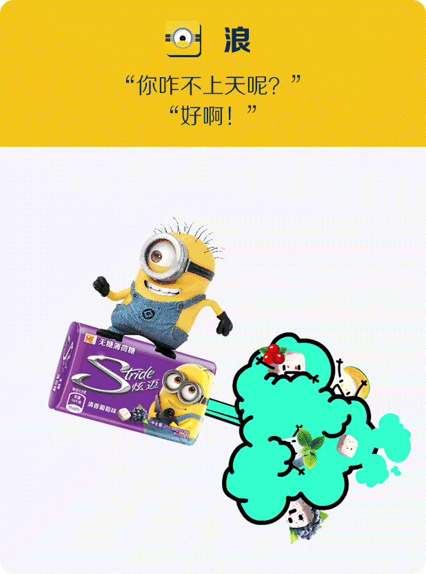 小黄人和炫迈在微博上晒出了一组分别以骚、浪、贱、萌为主题的gif动图。并哼了一首小黄人之歌:“在那山的那边海的那边,有一群绝顶聪明的小黄人,他们骚得优雅,浪得清新,贱得高冷,萌得真诚……他们终于打破魔咒找到人生真爱!”