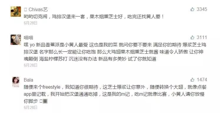 网友们纷纷展示自己的freestyle才华。在征集帖下点赞最高的是“哟哟切克闹,鸡排汉堡来一套,果木烟熏芝士好,吃完还找黄人要!”