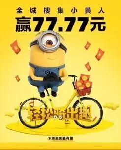 为了回馈市民,这对黄黄CP还推出了全城寻黄,赢77.77元礼包的活动。有效骑行ofo大眼车超过200米,可获赠一张“小黄人卡”。集齐5张不同的卡,便有机会赢77.77元现金大奖。