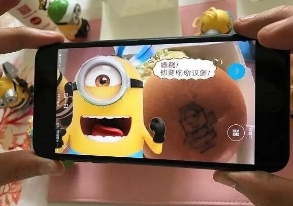 如果你打开手机版QQ扫描这些汉堡身上的小黄人形象,便能打破次元壁,闯入小黄人的世界,和他们自拍合影。