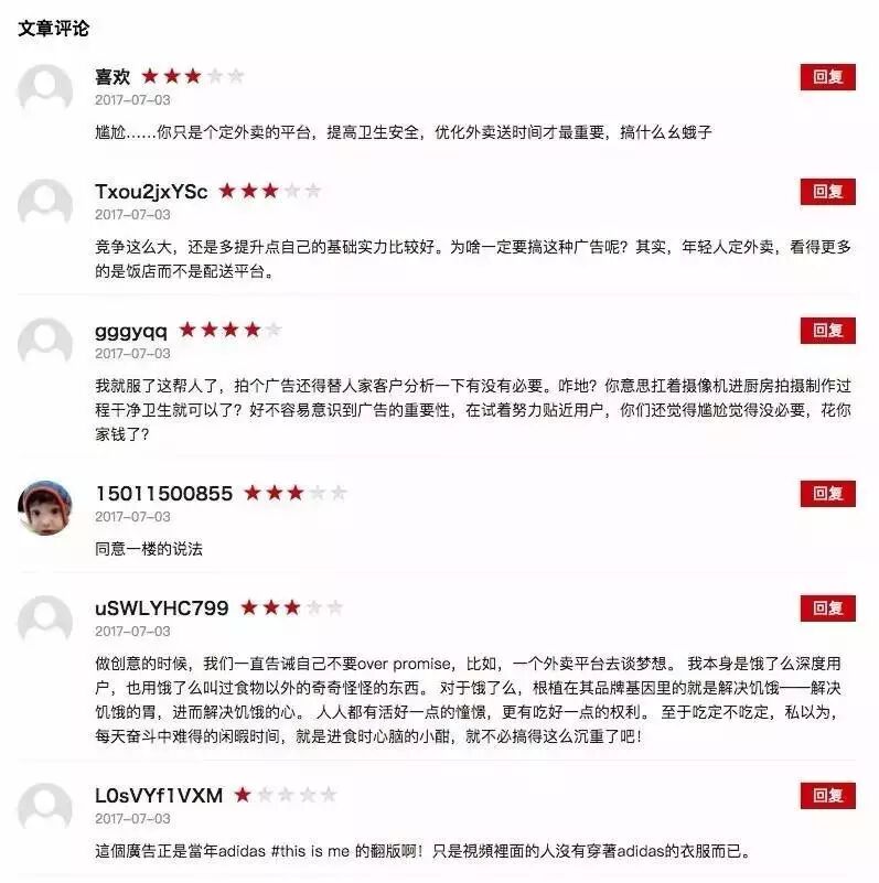 但与此同时,饿了么这支TVC也受到了非常大的争议。网友们的槽点主要集中在,“为何明明是不同行业的品牌,却逐渐三观趋同?”这般充满倔强感的广告,在阿迪达斯original、陌陌、淘宝等品牌身上也屡见不鲜。“酷”“潮流”“有态度”成为常用标签。