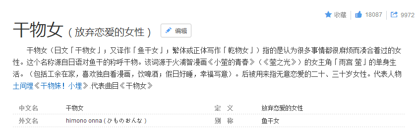 类似日本的“干物女”,一群无意恋爱的二、三十岁女性,工作时间几乎全速运行,下班回家第一件事就是把鞋子一甩,以3秒钟的速度将丝袜扯下,瘫软在沙发上。她们是认为很多事情都很麻烦而凑合着过的女性,放弃恋爱,依赖网络,作息时间不稳定,一个人也敢上热闹的餐厅吃饭。但在累到变形的日常节奏下,“干物生活”也被认为是一种找回真正自己的方式。
