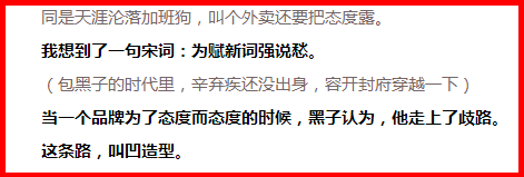 自媒体“广告黑榜”评价这支TVC是“为赋新词强说愁”,“当一个品牌为了态度而态度的时候,他走上了歧路。这条路,叫凹造型。”