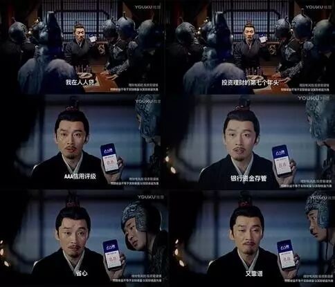 《军师联盟》的“创意中插”广告属于优酷“内容营销”系列中的一员,在每一集正片之中插播,由剧中的演员在剧中的场景展开一段脑洞风暴,也被称为“夹心式”广告。