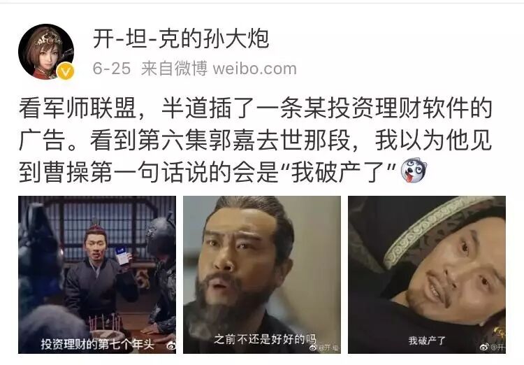 《军师联盟》第一集中就出现了一支中插广告,原本在给曹操出谋献策的郭嘉,转身出现在小广告里给自己订了个写有数字7的蛋糕,士兵们都没猜到原因,郭嘉一本正经地说,这是他在人人贷投资理财的第七个年头。