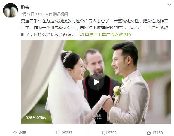因奥迪广告把女性比做二手车,甚至像牲口一样检查新娘身体情况,引爆了关于“物化女性”的争议。这则视频最早来自于7月17日@脸侠 发布的微博。