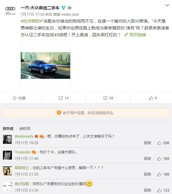 评论中网友清一色的表示愤怒,甚至有人质疑奥迪公司的价值观和内涵。