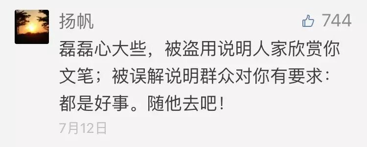 但与此同时在评论区,我们看到的却是:“磊磊心大些,被盗用说明人家欣赏你文笔;被误解说明群众对你有要求,都是好事,随他去吧!”