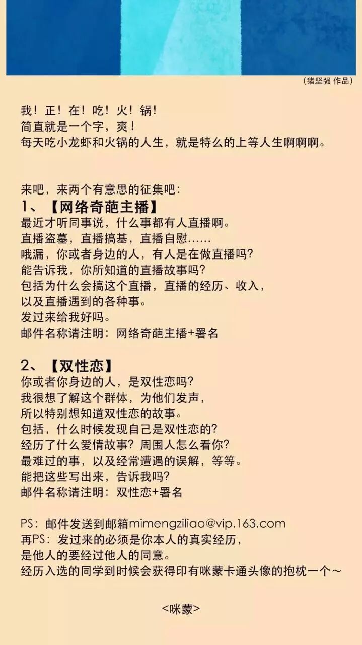 自己忙不过来(xiang tou lan)的时候,一篇英雄帖发出去,千军万马来相见。向粉丝约稿,不仅混过了这一天的推送,而且还收获了之后的内容,又能多偷懒一天啦嘻嘻~