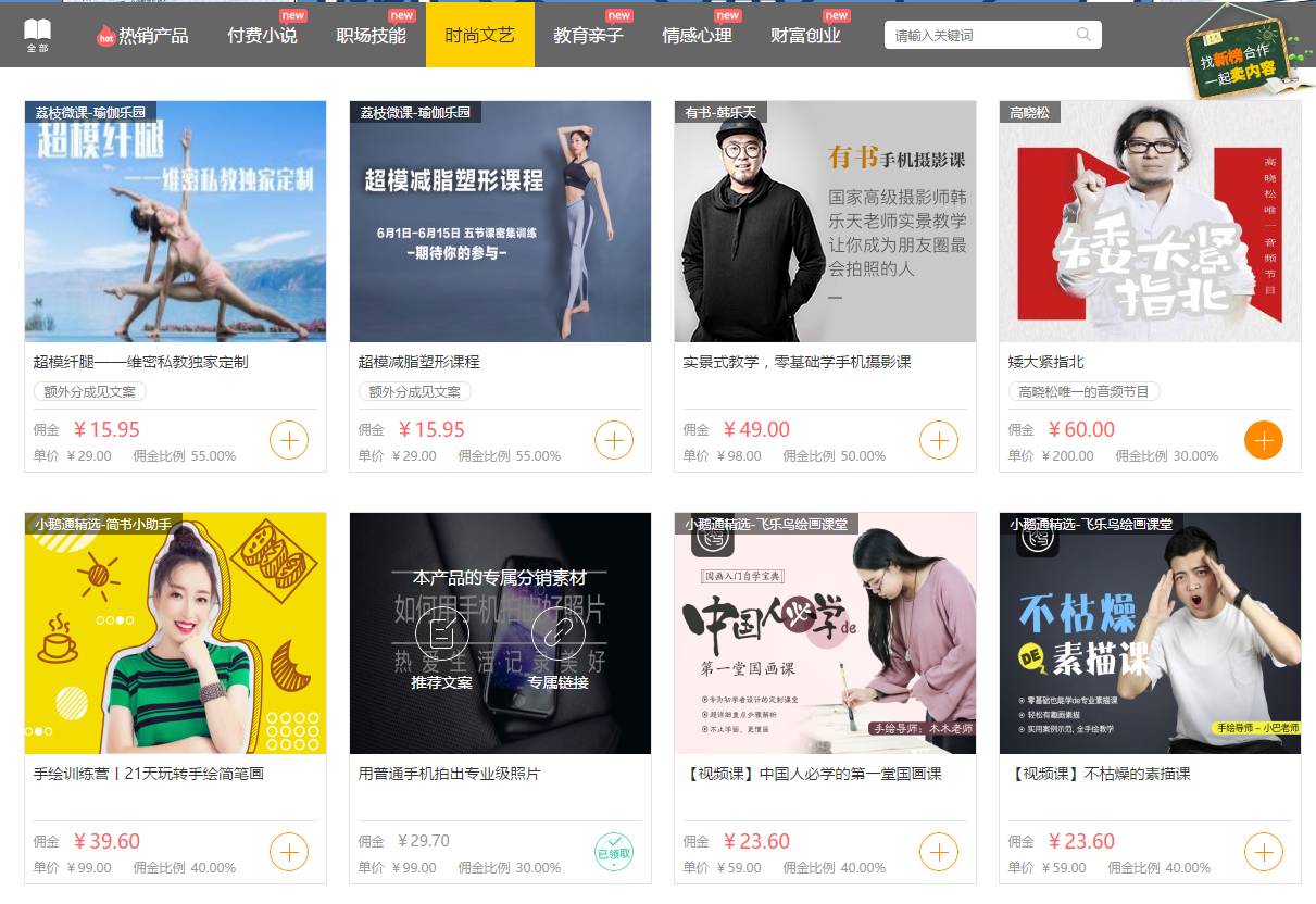 现在,在“新榜知识付费分销平台”上,精挑细选的课程、小说、游戏、漫画已经组成了一个优质内容的大超市。没有灵感的时候,找不到选题的时候,去扒一篇分类对口的课程文案,不仅让推送的内容增色,还能增加一笔额外的收入。