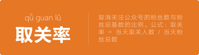取消关注公众号的粉丝数与粉丝总基数的比例。公式:取关率 = 当天取关人数 / 当天粉丝总数