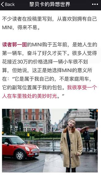 黎贝卡是作为目标人群的精准媒体来用的,就相当于从前的一份行业机关报纸,就这一群人看,这群人还就是高概率选购MINI的人群。