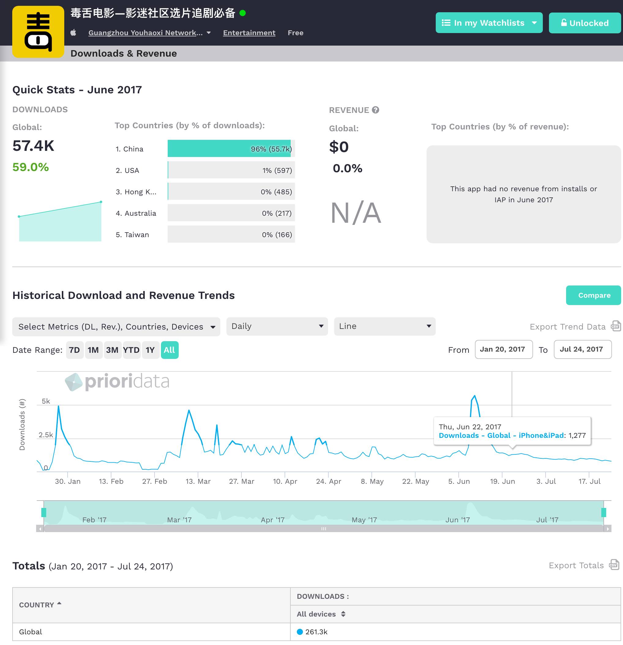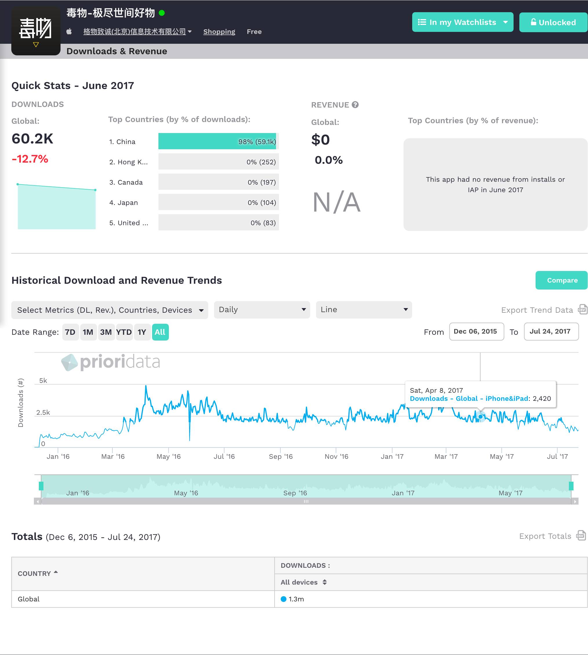 在新榜那篇文章里,我提到的毒物App(这是一个相当男性化的导购App),根据prioridata.com的监测,iOS生态中,从15年12月至今,总装机130万,当下每天能吸引新装机量2000左右,应该是自然增长。