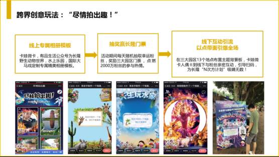 在旅游度假区拍照留着美好记忆,几乎是所有去过度假乐园的人都会做的事,这也恰恰给了卡娃微卡相册产品一个绝佳的创意传播机会。量子云旗下两大公众号卡娃微卡和有品生活,为长隆三大游乐园区——长隆野生动物世界、长隆水上乐园、长隆国际大马戏精心定制了专属相册模板,粉丝在相册上传精美照片就能参与抽奖,赢取三大园区的门票,而长隆在三大园区的13个热门景点也布置了创意拍照背景板,卡娃微卡IP人偶从虚拟世界走到了现实生活中与游客互动,引导扫码参与活动。