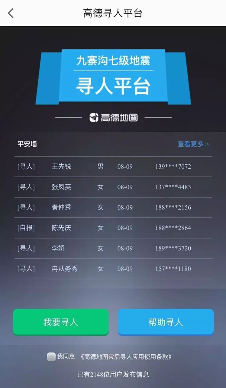 率先推出这一功能的今日头条,震后一小时内,便在自家App和微信公众号里推出了“地震寻人服务”,提供“我要寻人”与“帮助寻人”两大功能,同时,还能在“平安墙”自报平安。截至目前,已有近20万人参与。