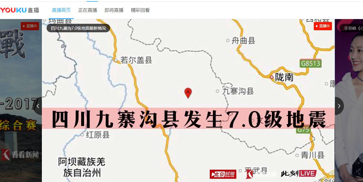 优酷直播首页,点开便能直接看到关于九寨沟情况的报道;目睹直播则为所有媒体免费提供直播流量和云导平台,做现场状况一手资料直播。