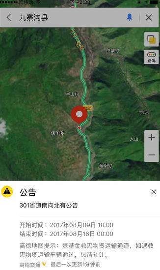 当晚,高德地图上线了九寨沟县周边的地震救灾事件提醒,以及由四川交警提供的多个救援路线封闭管制信息,同时还将对前往相关高速的司机进行提示。