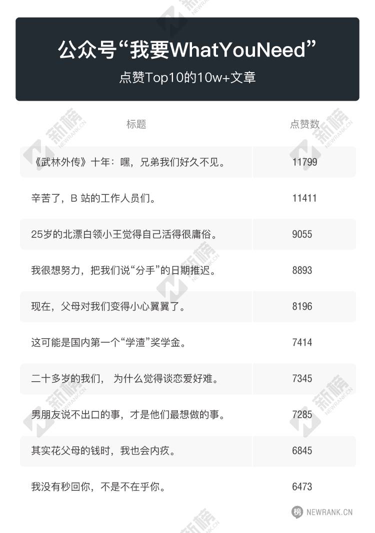 显然,他们获得了阶段性成功。根据新榜公众号回采,从2015年12月至今,公众号“我要WhatYouNeed”积攒起99万粉丝,总共发布了790篇内容,获得346篇10w+。