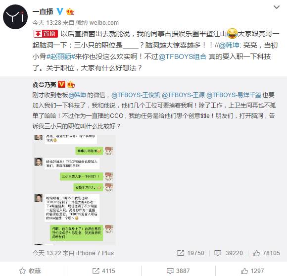 今天下午,一直播微博公布,TFboys即将入职一下科技,具体职务将在8月27日的明星盛典上公布。至于为什么是入职而非代言?有业界人士认为,明星如果担任内部职务,将巧妙地规避新广告法,以另一种方式进行品牌代言。
