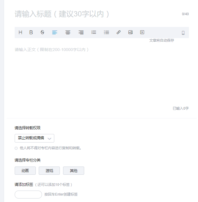 值得注意的是“转载权限”的选项,可以看出B站专栏从一开始就在原创保护方面发力,借此吸引优质的原创内容,这与隔壁AcFun更像是BBS的文章区有明显区别。