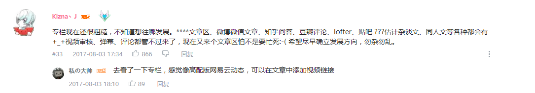 在B站上线专栏话题的讨论区,不少用户提出了自己的想法,有人对专栏的发展方向提出疑问,也有人觉得更像网易云音乐,因为可以在专栏里加上视频链接。