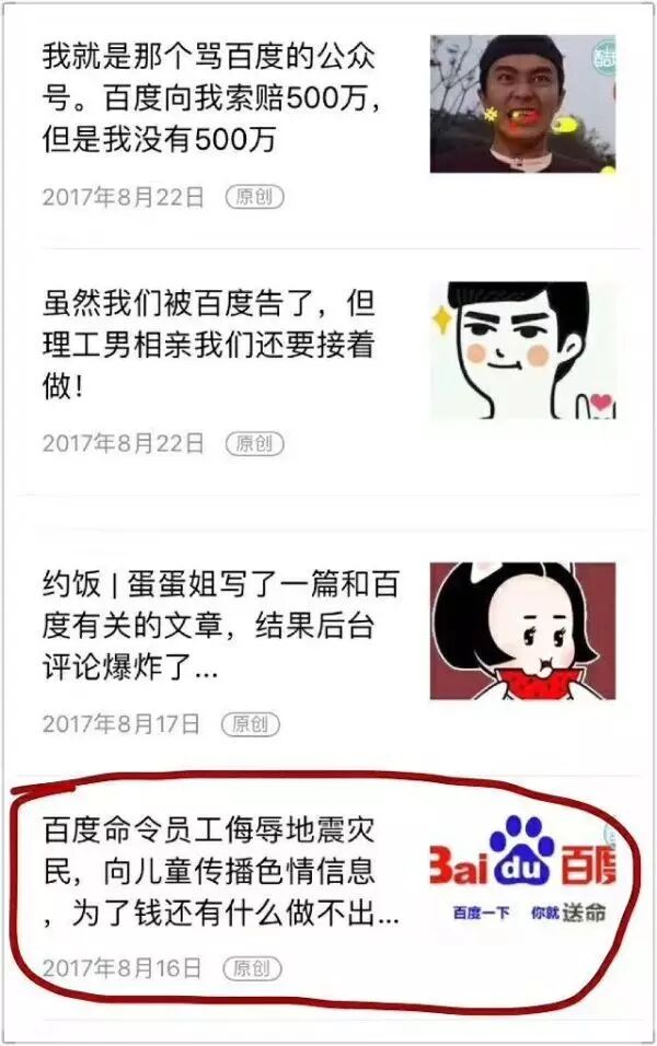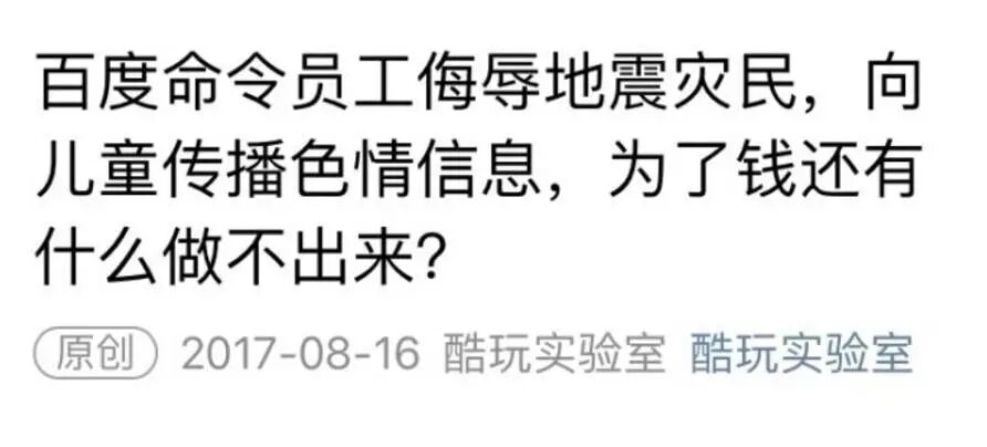 不过也有人顺藤摸瓜,翻出8月16日“酷玩实验室”的推文。看到“百度命令员工侮辱地震灾民,向儿童传播色情信息”的标题,还是让很多刚骂完百度的“不明真相群众”虎躯一震:百度竟能命令员工干这事?