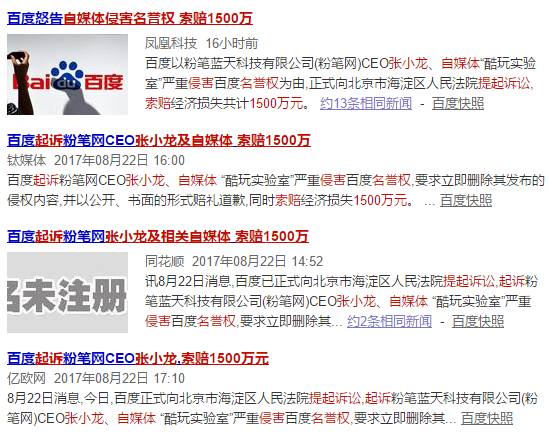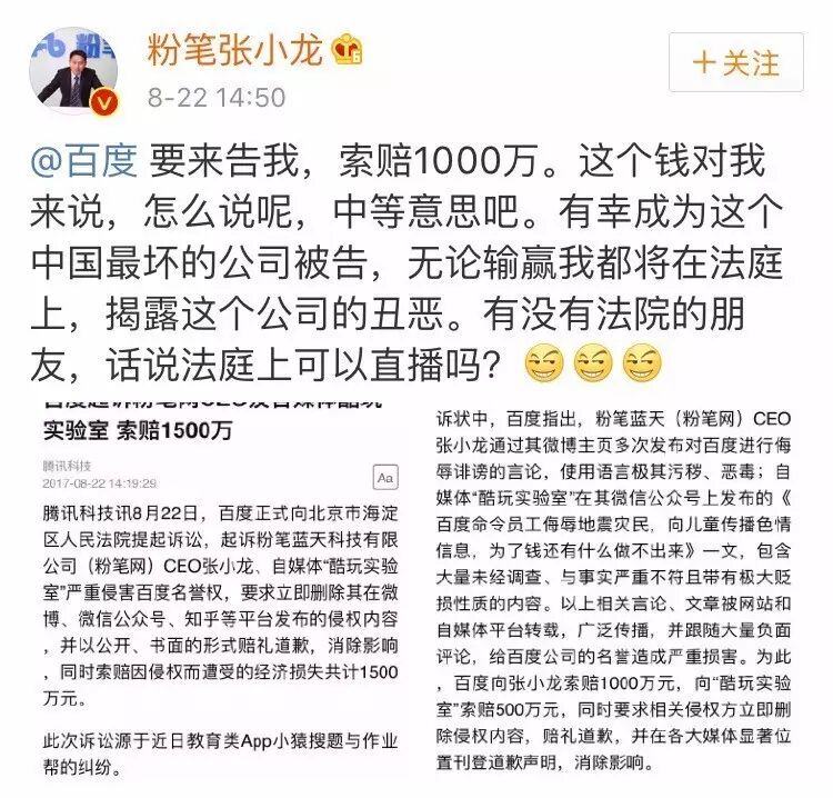8月22日,百度以粉笔蓝天科技有限公司(粉笔网)CEO张小龙、自媒体“酷玩实验室”严重侵害百度名誉权为由,正式向北京市海淀区人民法院提起诉讼,索赔经济损失共计1500万元。其中,对自媒体“酷玩实验室”的索赔金额是500万元。