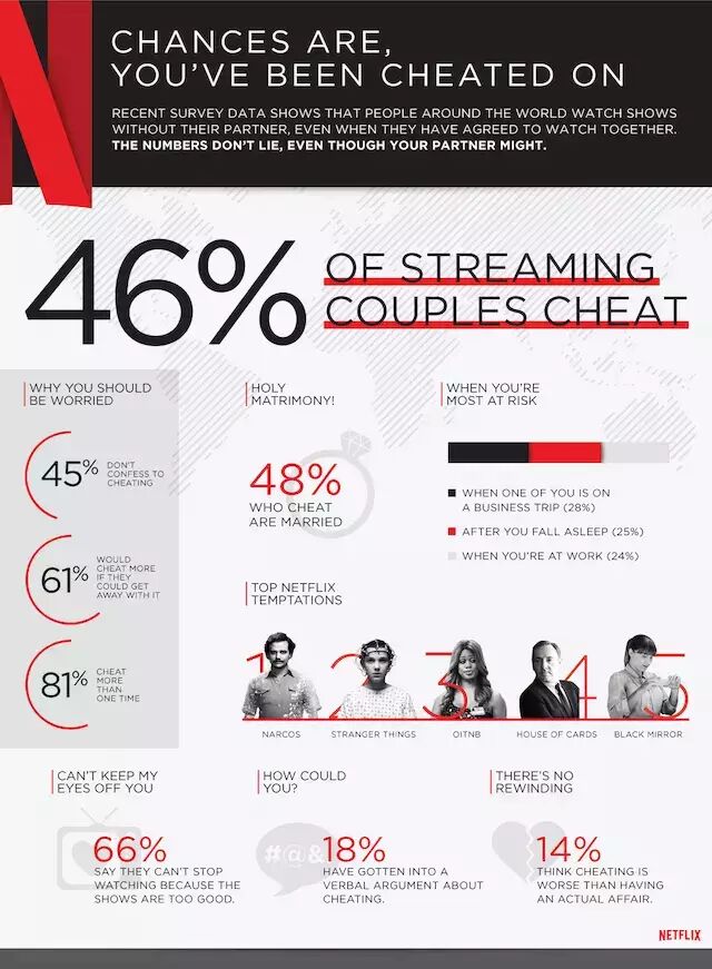 据Netflix最近一份报告显示,在流媒体时代,情侣关系破裂原因又增加了一名新成员——背着对象提前刷下一集剧。46%的流媒体couple用户之间都有过这种“欺骗”行为。