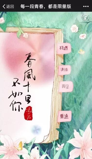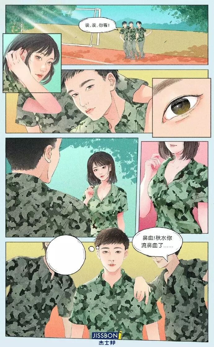 H5中的初遇部分,大学军训的秋水第一次见到小红,操场上,阳光下,女孩撩了一下头发,然后,秋水流鼻血了……大学、初恋,可能是很多人心里美好的青春回忆。